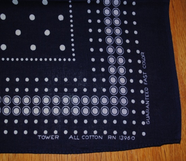 上の写真のバンダナは通称タワーと呼ばれるバンダナです。”GUARANTEED FAST COLOR”に加え、”TOWER”, “ALL COTTON”と”RN13960”が表示されています。