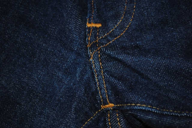 こちらはビッグEのクロッチ部です。写真の上部中央にオレンジ色のバータック(カンヌキ)が入っています。上の写真と比較してみて下さい。この部分のバータックはフライ部の取り付け強化のために追加されたものです。ビッグE以降、現行まで引き継がれているディテールの特徴です。