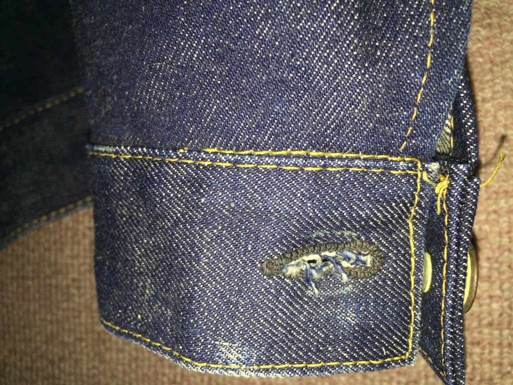 バックヨーク(背中の肩の下側に横に入る生地のつなぎ合わせ部)のパッチ取り付け部の少し右下の下側のチェーンステッチが切れています。ステッチで切れている箇所は上記と本箇所の二つのみとのことです。
