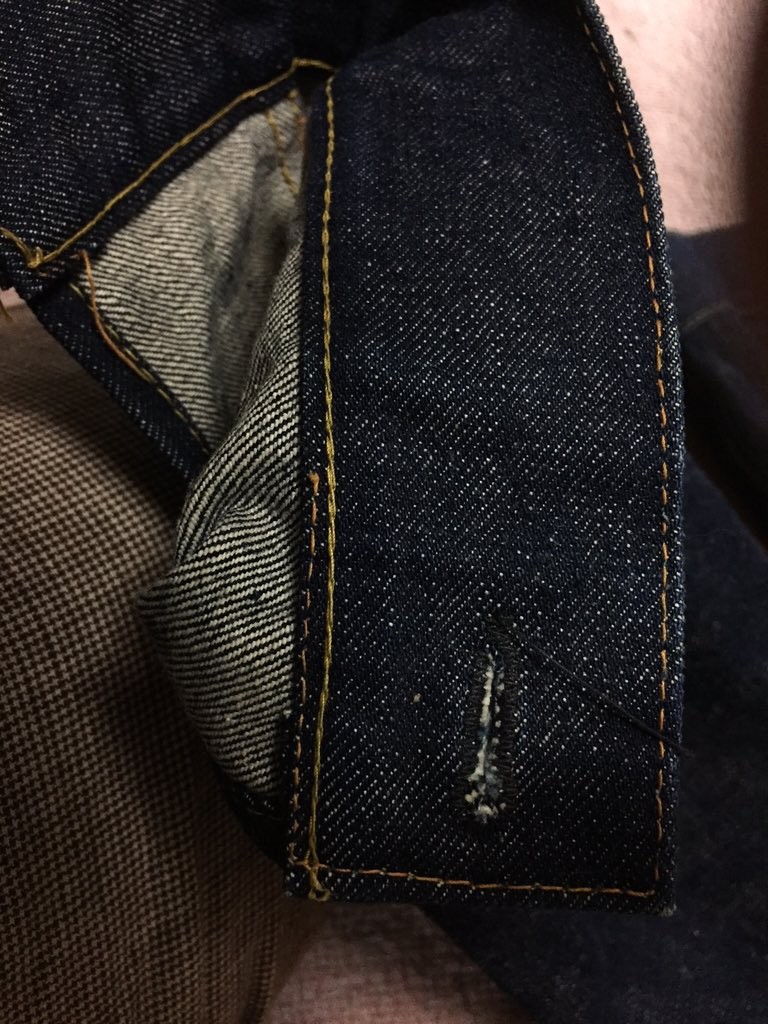 ウエストバンドのアジャスターボタンのそばのチェーンステッチの一部が切れています。デッドの状態の時からこのステッチ部分は切れていたそうです。