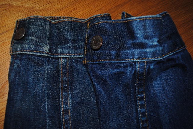 後ろからの写真です。ウエストバンド裏のチェーンステッチの状態も、右の標準仕様はほぼ全て残存、左のサード仕様は一部消失しています。