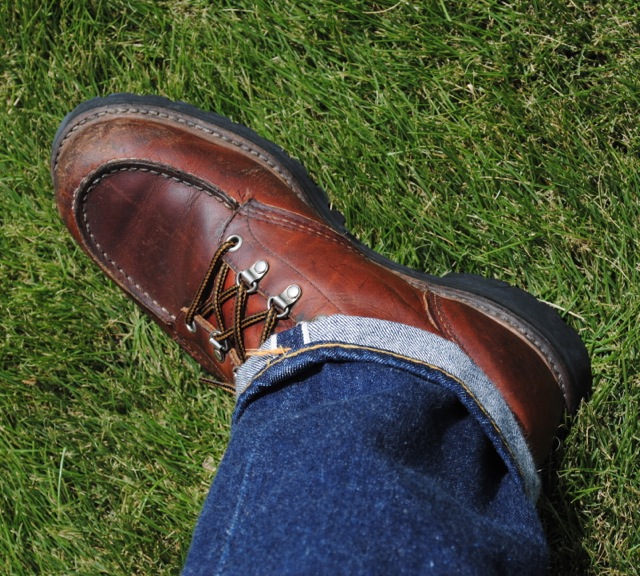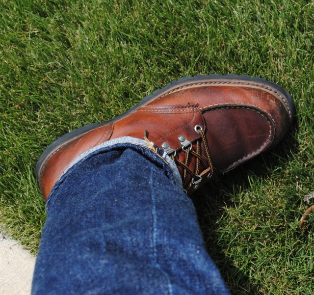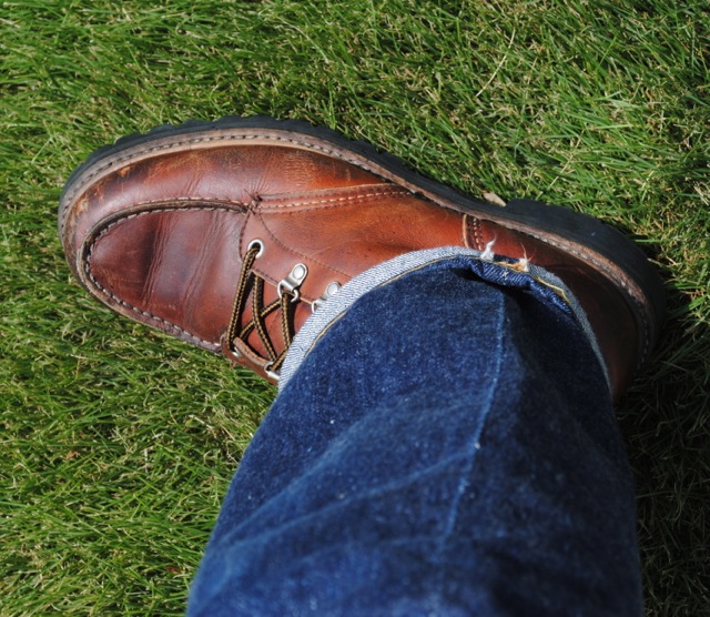 本品を履いて、屋外で撮影した写真です。太陽の下で見ると写真の様に、赤茶をしています。上の室内で撮影した写真よりもかなり明るめの色をしています。