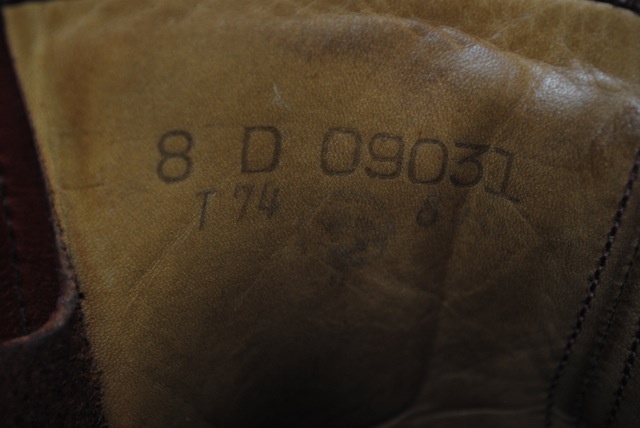 本品の内側はスムースレザーの内張がされています。表記サイズは8D。製造年は1974年と判定できます。