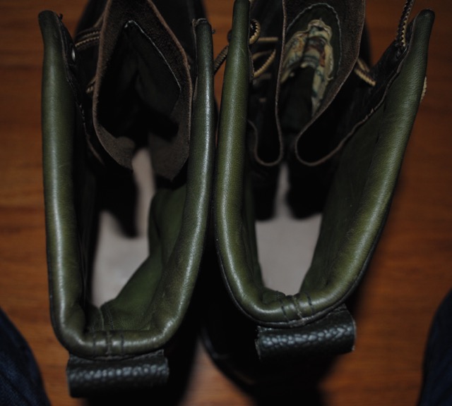 足の挿入部は少し明るめのグリーンのライニングが施されています。シャフトの内側も非常に質感の高いスムースレザーのライニングが入れられています。