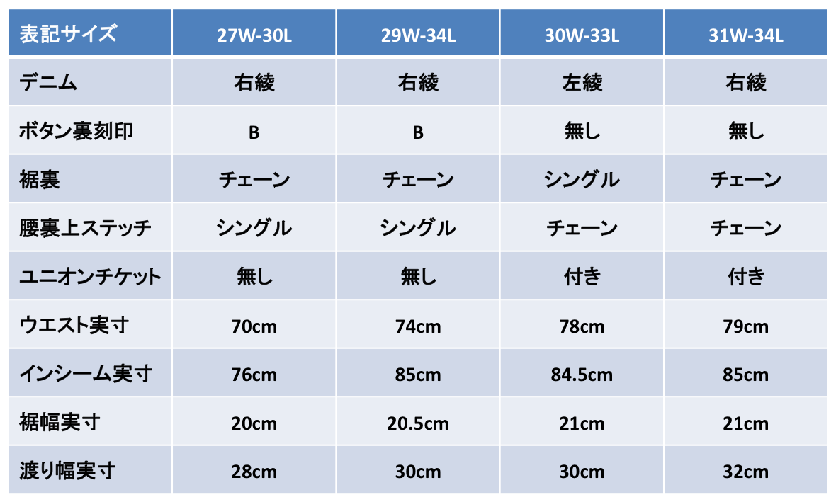 今回の入荷ロットの中で裾裏のステッチがチェーンとシングルと両方が確認されています。以下、各サイズの裾部の拡大写真です。