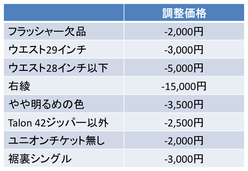 具体的な価格設定は以下の様になります。商品の価値、希少性、同年代のリーバイス社の製品と比べると、今回設定したLee 200の基準価格は破格だと思っております。