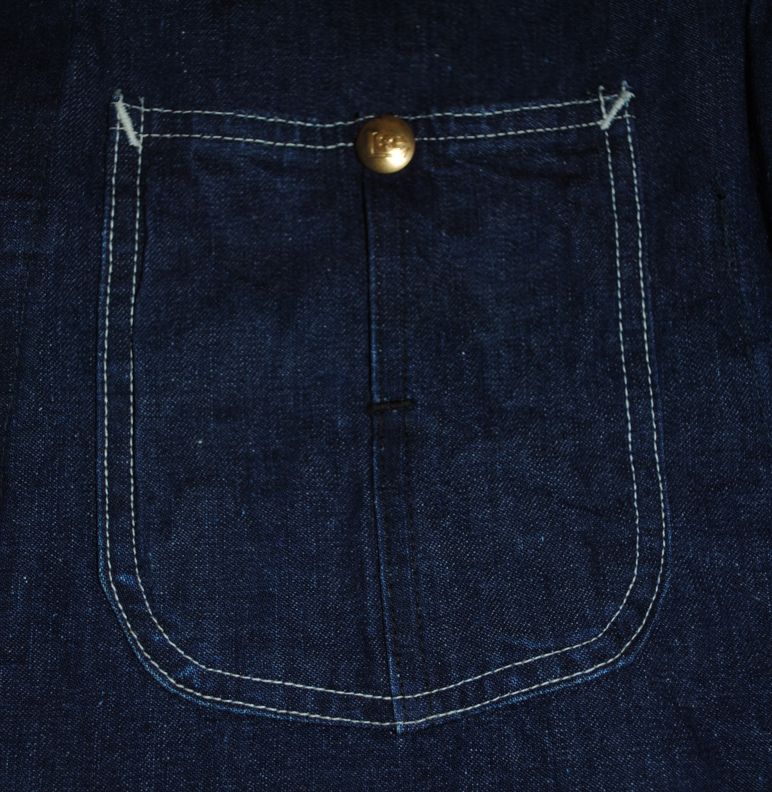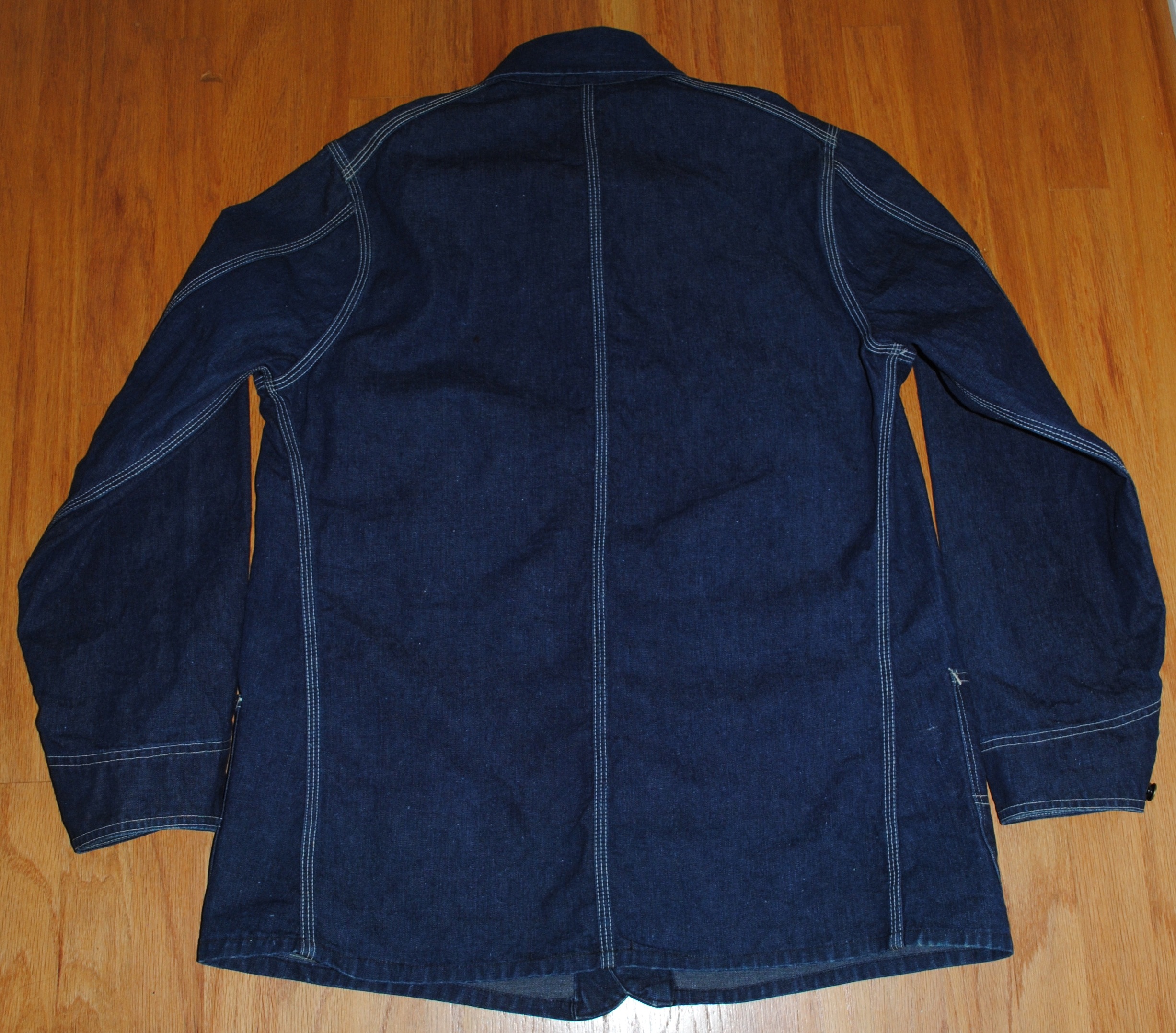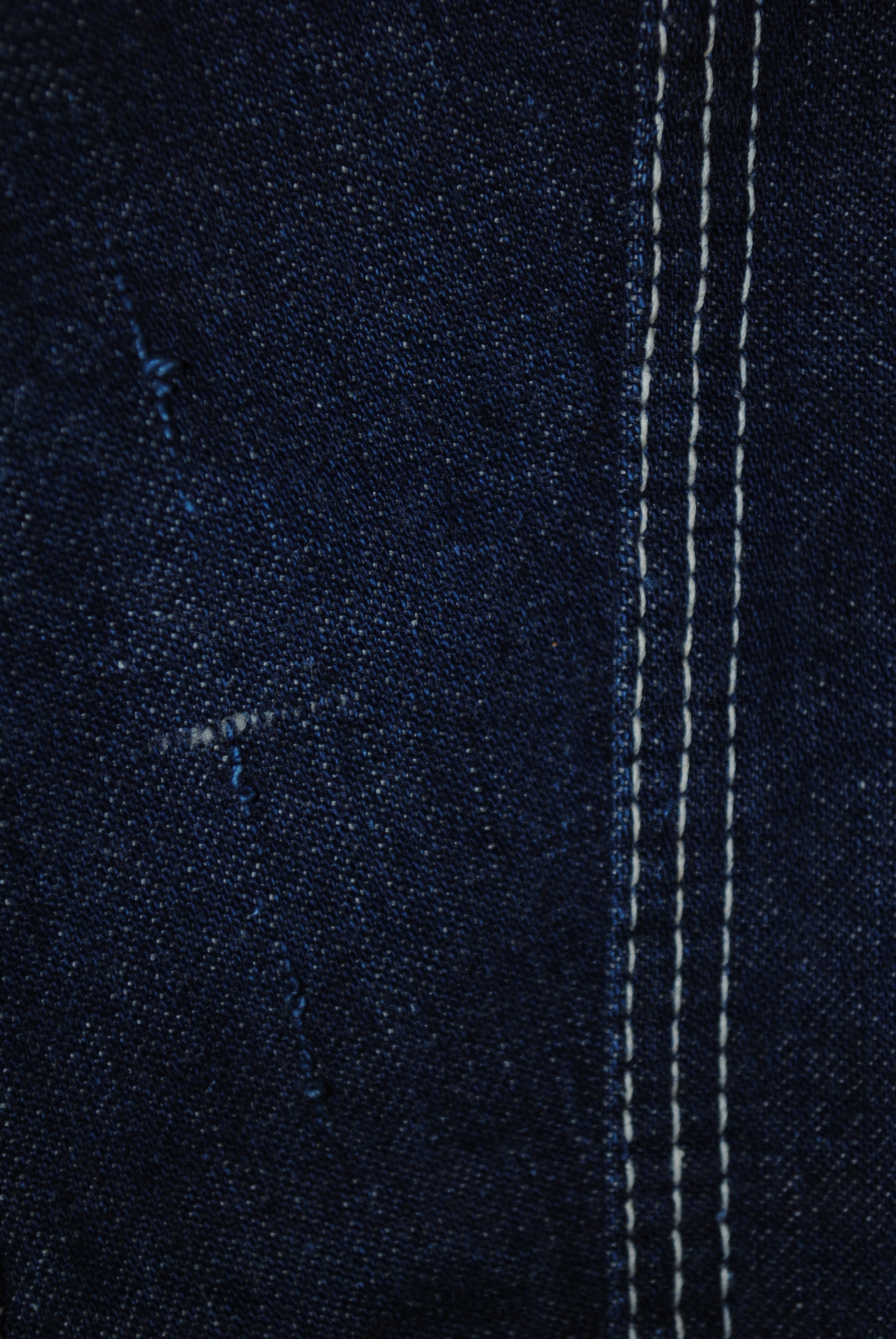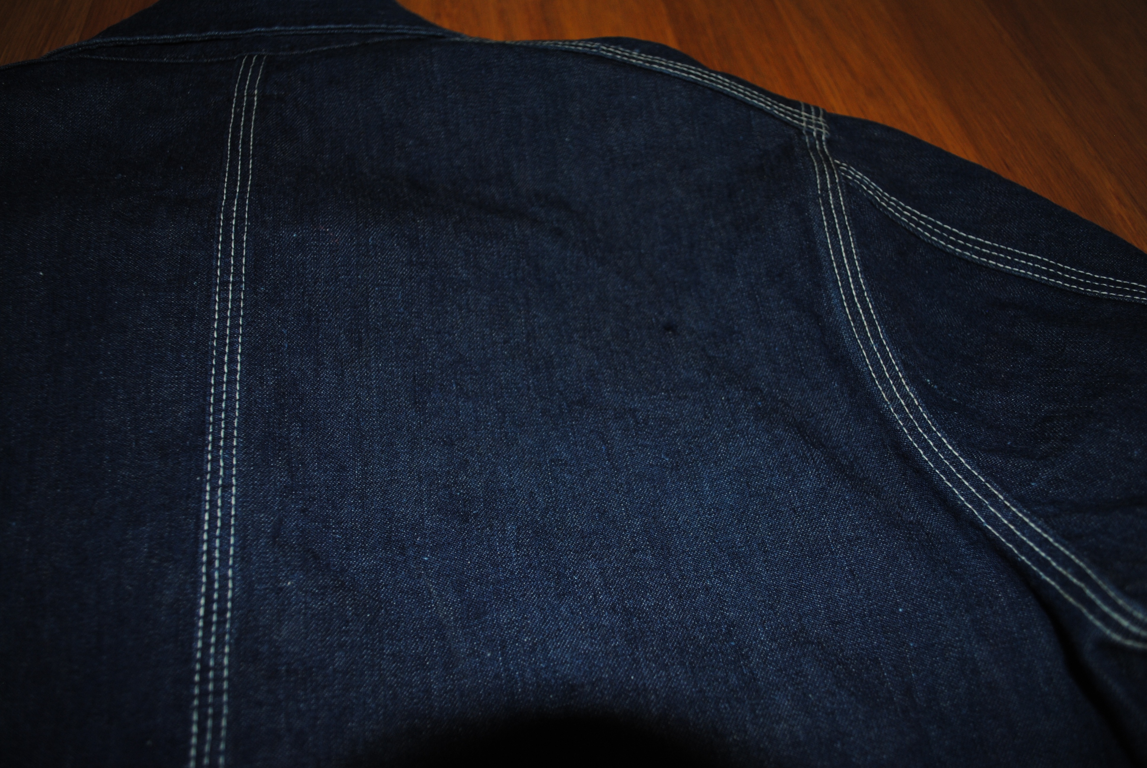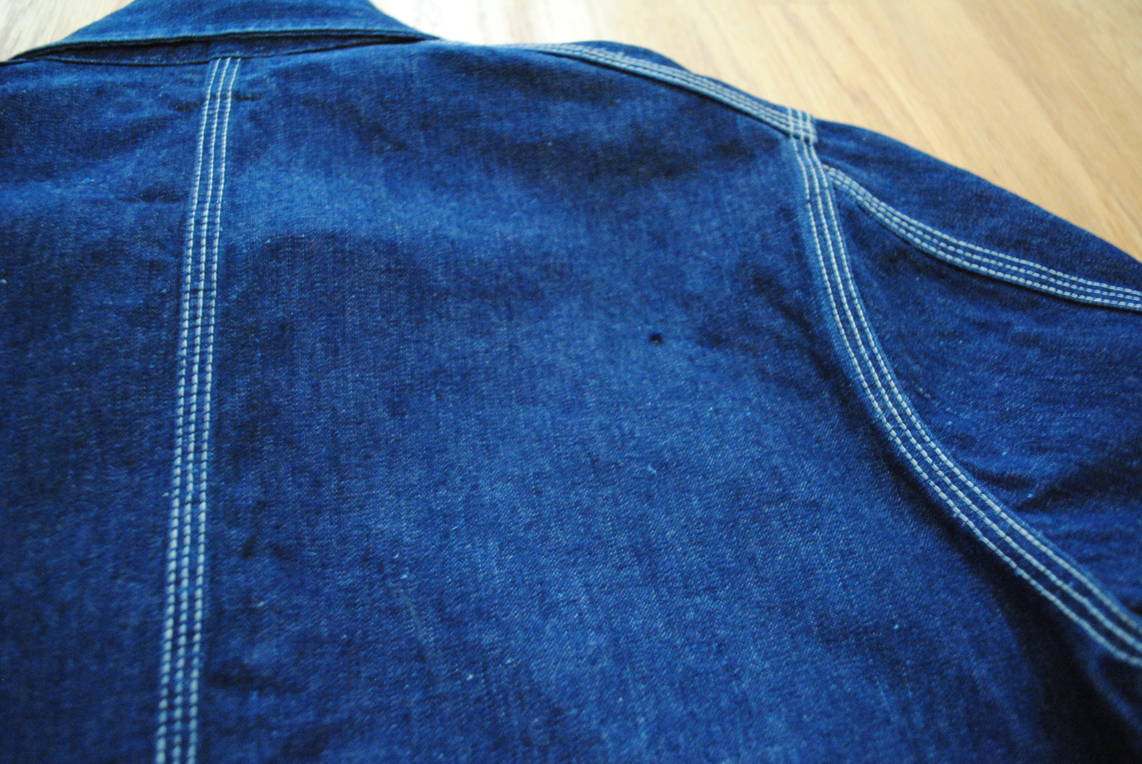 光を入れ気味にして撮った写真です。実際よりかなり明るい青に写っています左肩トリプルステッチの左に小さく濃い点状のものがありますが、それが上記糸玉の様な箇所です。