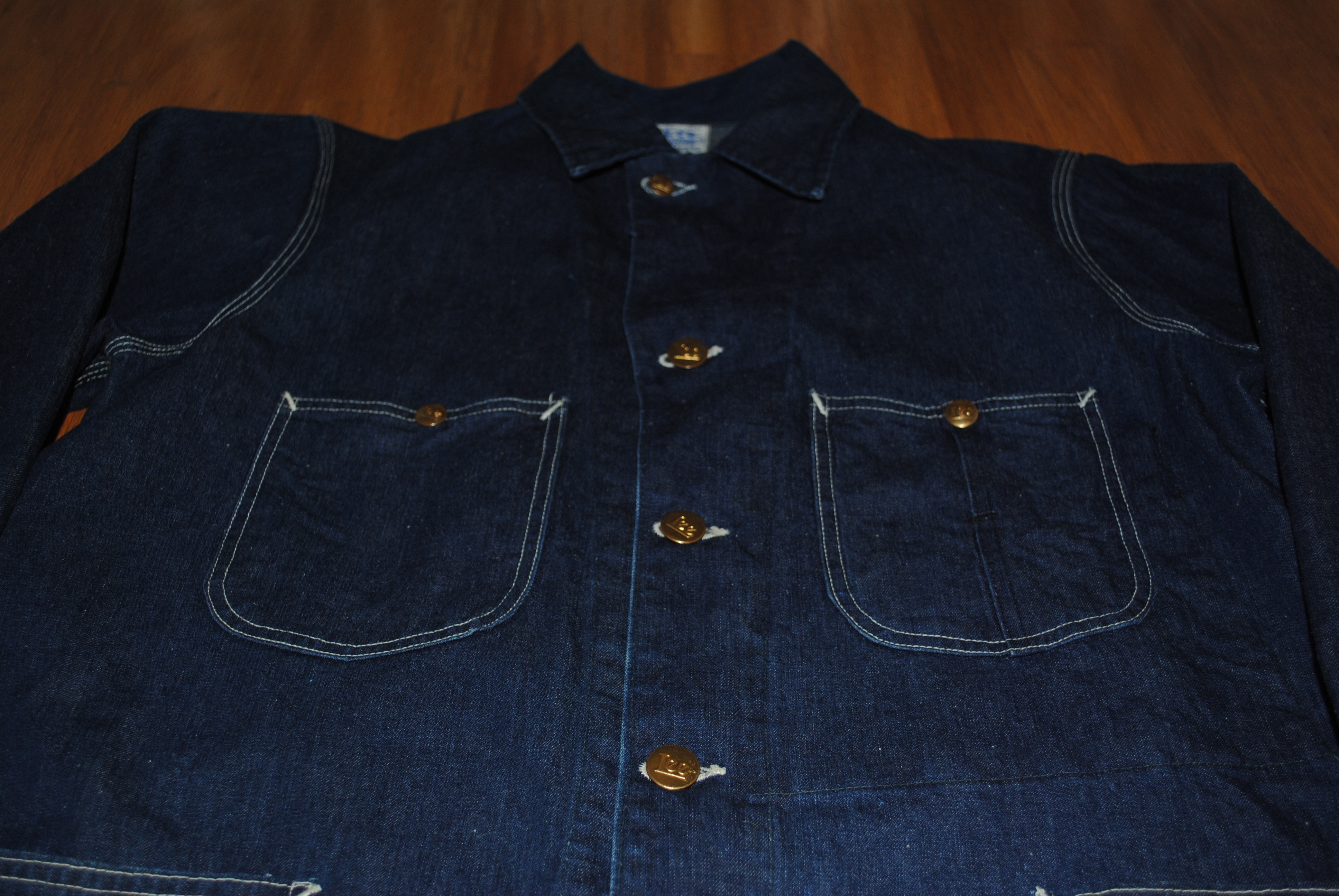 ヴィンテージ Lee 101-J ハウスマーク 前部全体写真20世紀の初めから1960年代までの長い期間、Leeはワークウェアで非常に強いシェアを持っていました。Leeのカバーオール91-Jは1928年頃に市場に登場したと言われています。最初期のモデルはチンストラップ、右胸ポケットにフラップが付いています。