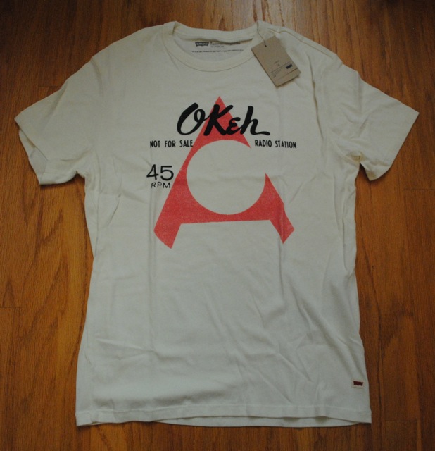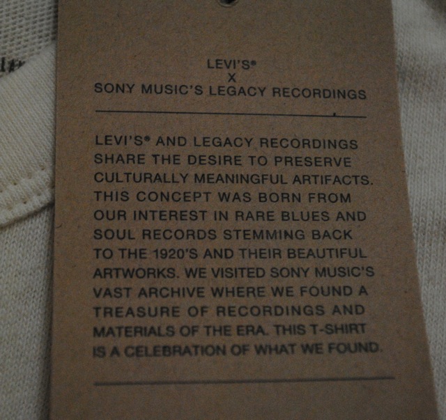上記タグ記載内容の意訳:”リーバイスとレガシーレコーディングズは、文化的に重要な意味をなす作品を保存すべきとの考えに合意しました。このコンセプトは、1920年代の美しいアートワークの希少なブルー・ソウルレコードに対する我々の興味から端を発しました。我々はソニーミュージックの莫大なアーカイブの中から宝物の当時のレコーディングとマテリアルを見つけました。このTシャツは、我々が見つけた物を祝うものです。”