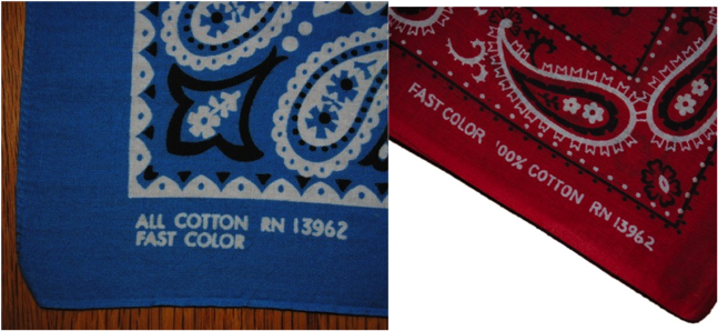 このバンダナの表記は、左にエレファントのロゴマーク、その右に2行での表記があります。一行目は”ALL COTTON RN#13962″, 二行目は”WASHFAST COLORS”です。
