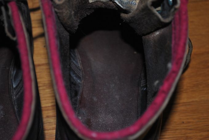 本品は、とても特徴的なトゥの形状をしています。そして、シャフト上部(足を入れる口)に明るい赤(蛍光色系)の布地のパイピングが取り付けられているのもとても珍しいです。