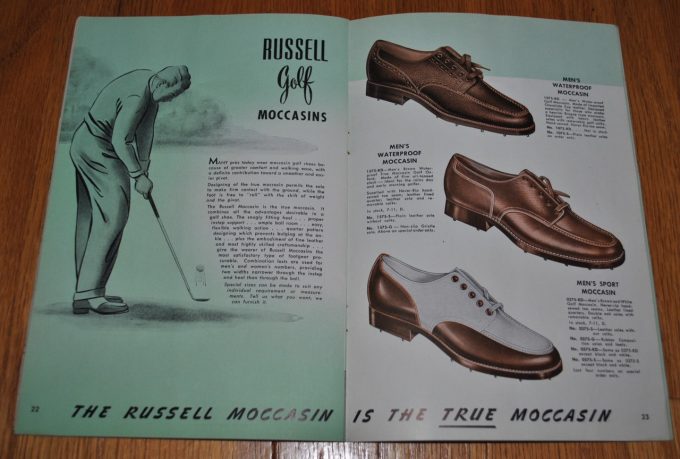 オックスフォードタイプの短靴やゴルフシューズも、全てモカシントゥです。ページの下には、THE RUSSELL MOCCASIN IS THE TRUE MOCCASINのコピーが入っています。