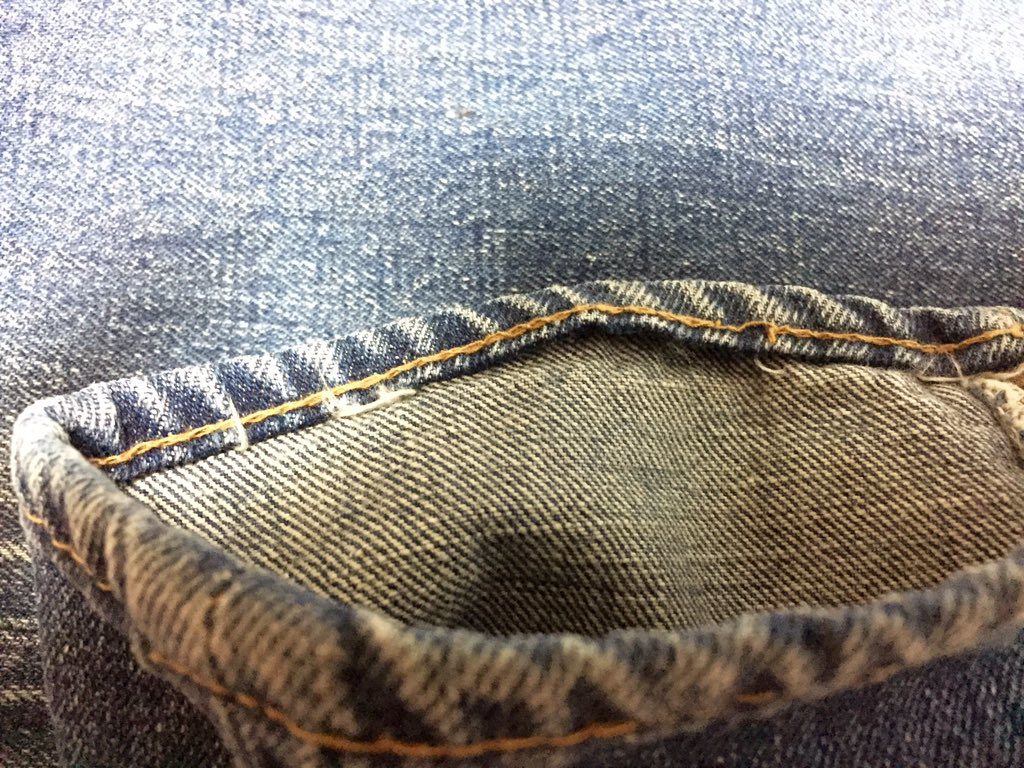 上記表側のステッチの部分的消失はあるものの、全体的な裾の状態、チェーンステッチの状態も比較的良好です。セルビッジの赤いラインは退色して薄っすらとしたピンク色をしているのが写真からご確認いただけるかと思います。