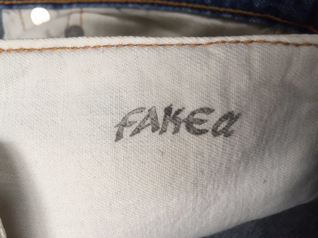 ケアインストラクションのスタンプがスレーキにないこと、フライボタンは通常R、アウトシームの縫い合わせはシングル-チェーンであることなどから、本品はビッグEの最終期と判定しています。