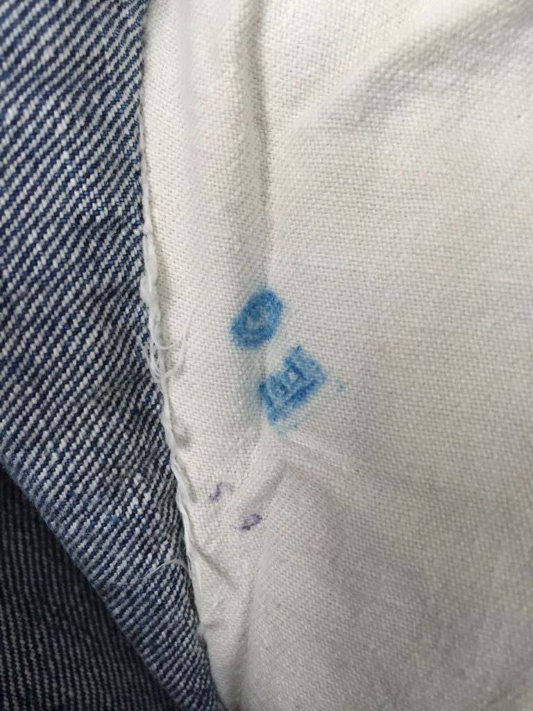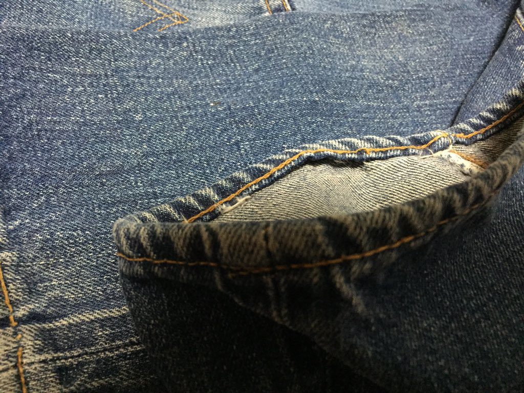 裾のチェーンステッチの状態、アタリなどから、本品は裾はオリジナルのチェーンステッチと推定しています。